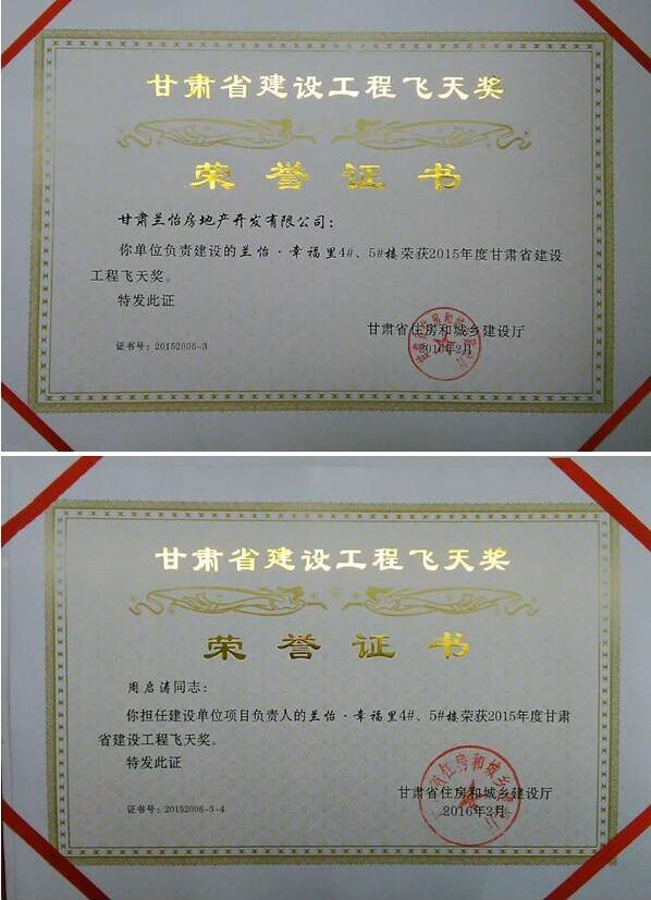 2016年2月55日,中集幸福里榮獲2015年度甘肅省建設工程“飛天獎”;