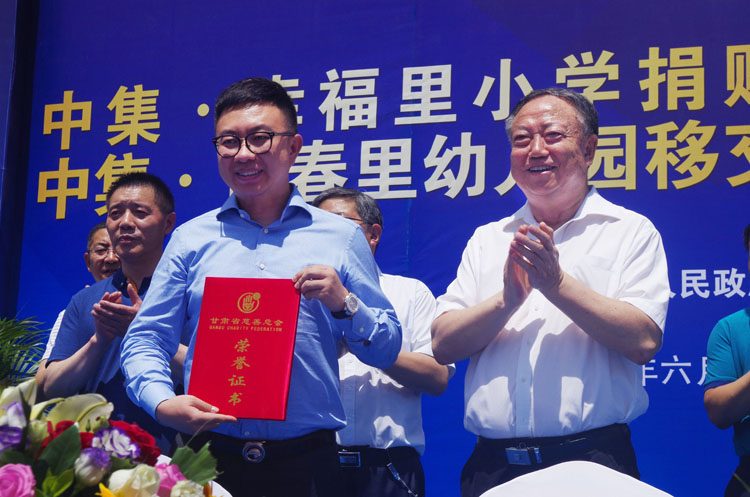 甘肅省慈善總會(huì)朱志良會(huì)長(zhǎng)向甘肅中集實(shí)業(yè)集團(tuán)有限公司董事長(zhǎng)周啟濤頒發(fā)榮譽(yù)證書(shū)