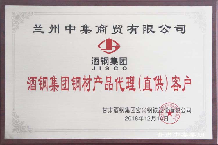 2018年12月12日,由酒鋼集團宏興鋼鐵股份有限公司組織的“2019年酒鋼碳鋼產品推介暨客戶座談會”及“2018年度全國百家金牌供應商頒獎典禮”在蘭州皇冠假日酒店召開。甘肅中集實業(yè)集團有限公司及下屬子公司蘭州中集商貿有限公司、天水中集商貿有限公司榮獲“酒鋼集團鋼鐵產品代理(直供)客戶”及“2018年度金牌代理商”殊榮。